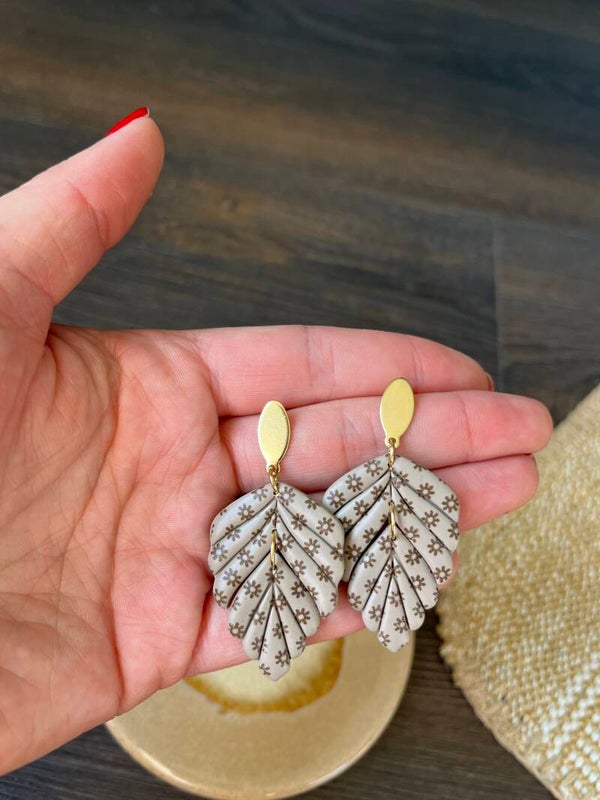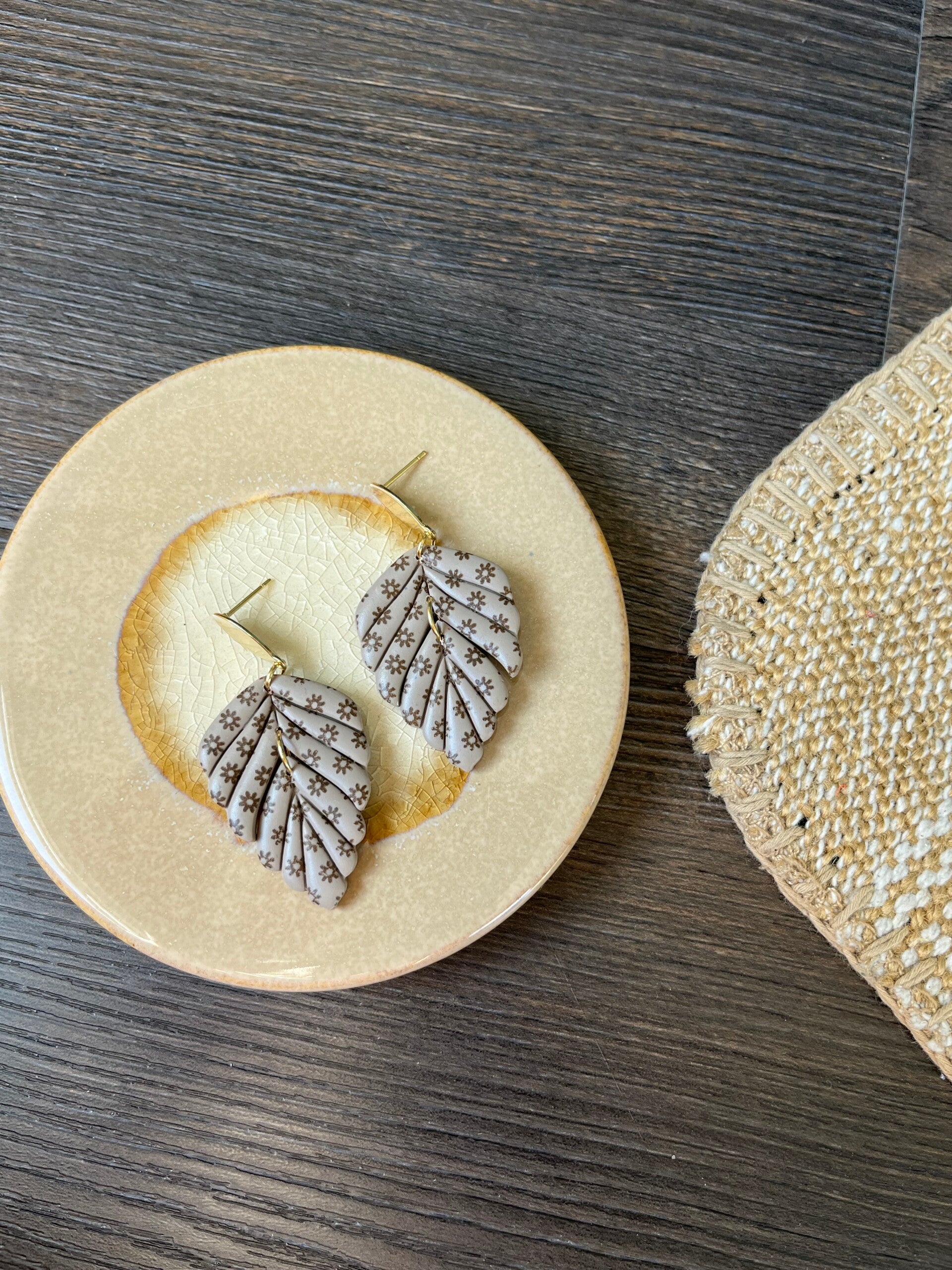 Mooie hanger in een taupe kleur met bloem design. De gouden steker is van rvs