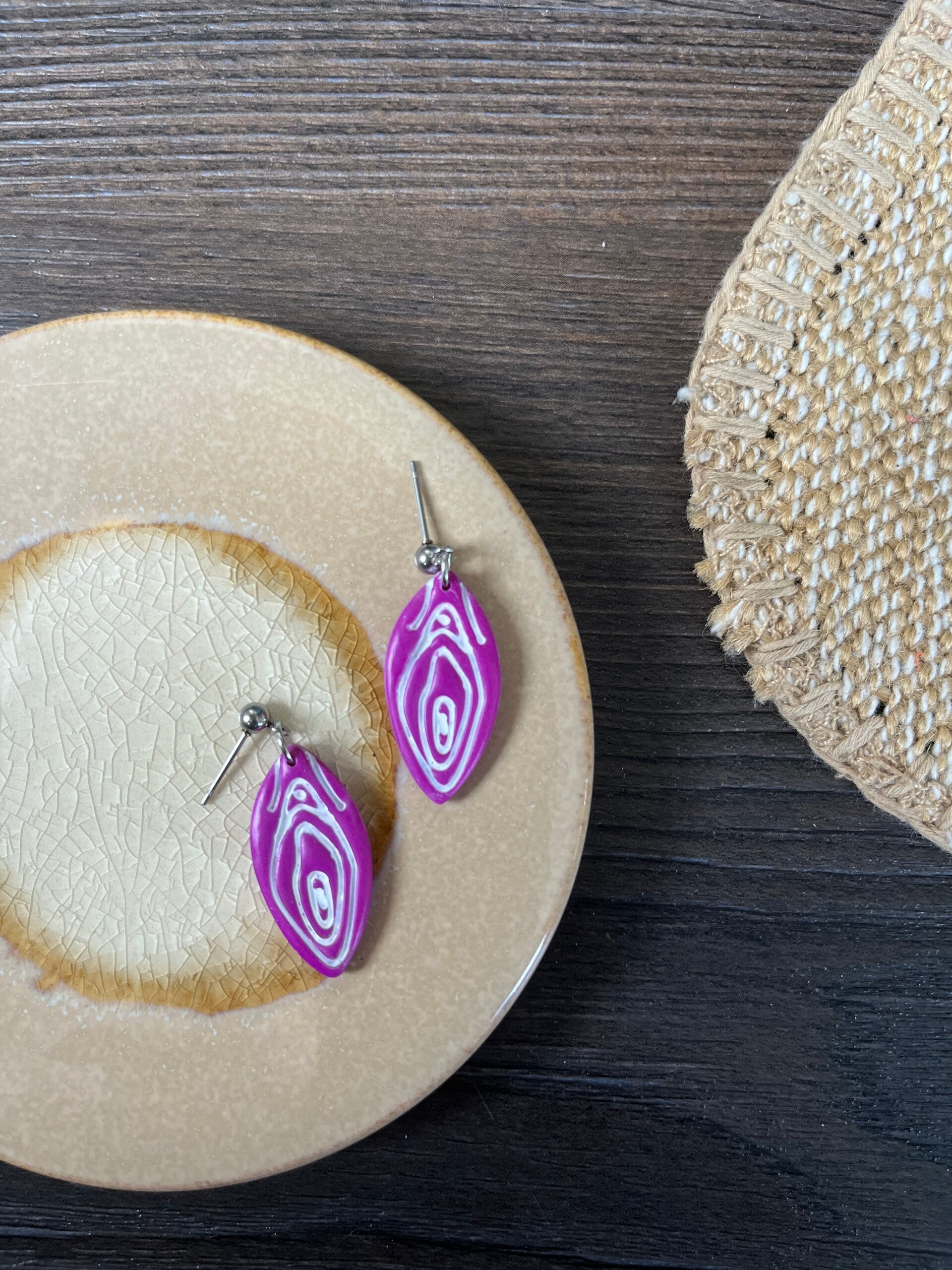Kleine Vulva oorbel in paarse kleur.